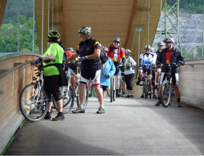 09:00 Abfahrt: 12 Radfahrer, 17 Personen nehmen das „Einfach Raus Ticket“ der Österreichischen Bundesbahn in Anspruch um das Defizit der Bahn zu reduzieren. Begleitfahrerin Angela ladet Nußschnaps ein und begibt sich auf die Strecke. Das dreckige Dutzend mit dem Rad unterwegs: Harald, Hermann, Stöckl Karl, Regina, Gabi, natürlich auch der Thomas, Krecht Richard, Jakob ist auch dabei, weiteres der Josef , Dietmar, unser Tempomacher Florian und Goll Leopold.